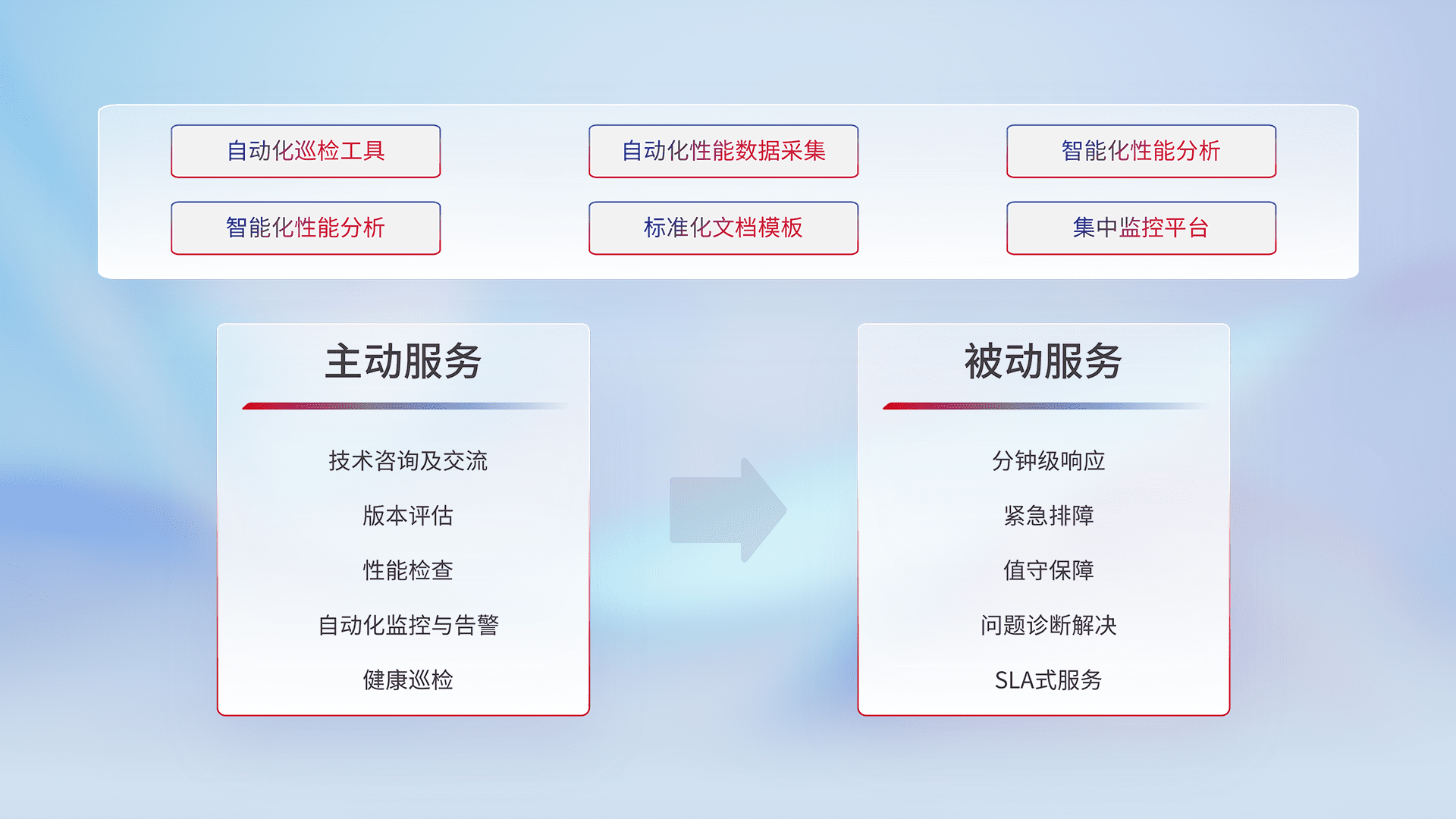 智能化工具和标准化文档,,,,保障服务质量,,提供主动服务(包含技术咨询、、、、版本评估、、、性能检查、、自动化监控与告警、、、健康巡检)和被动服务包含(分钟级响应、、紧急排障、、、、值守保障、、问题诊断解决、、SLA服务)。。
