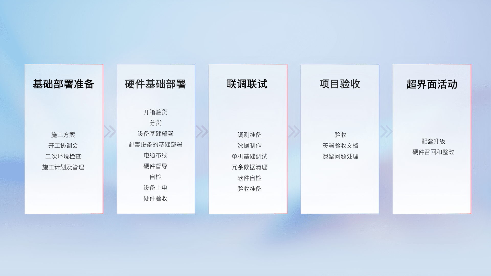 从基础部署准备、、硬件基础部署、、联调联试、、、、项目验收、、越界面活动的全过程可追溯,,,保证施工质量和进度。。